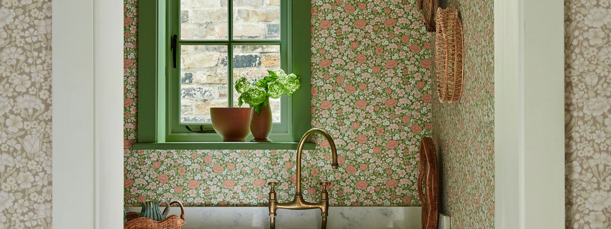 Little Greene Spring Flowers Wallpaper in Garden in a kitchen space