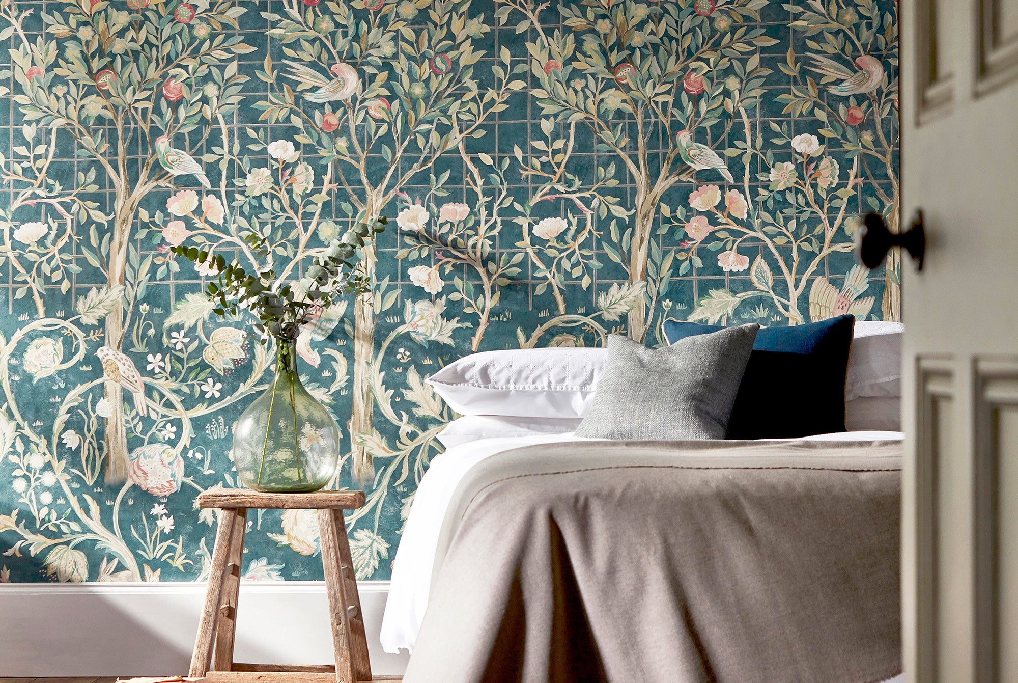 spectacular wallpaper design of birds and flowerheads trailing a central fruit tree inspired by May Morris'sembroidered bed hangings.