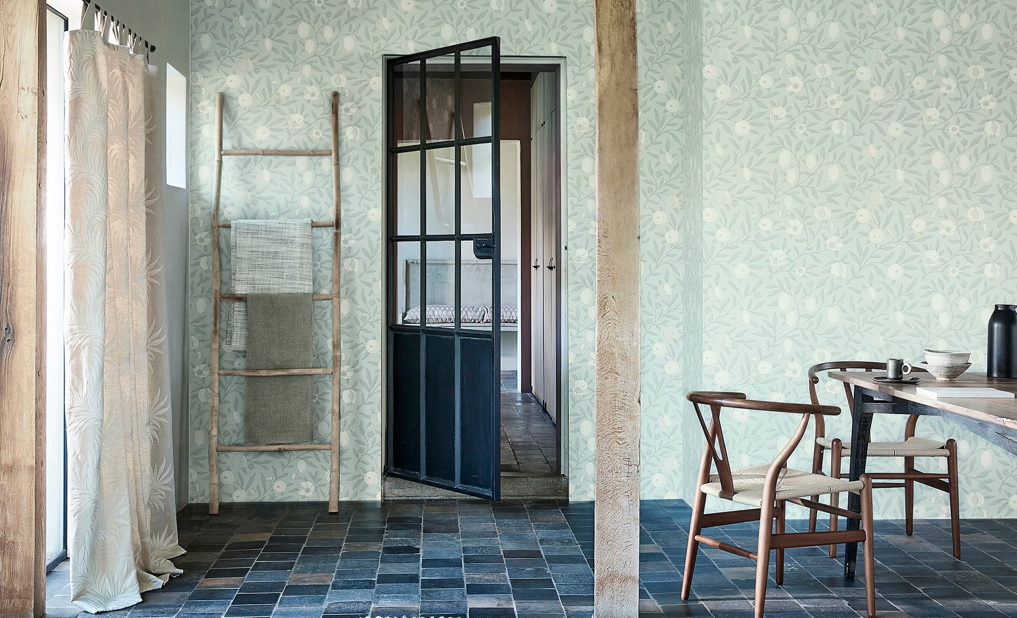 Description: One of Morris' earliest wallpapers was first produced in 1864. A joyful Arts & Crafts design with ripening pomegranate fruit on flowing branches. The beautiful opaque and chalky quality of the inks enhance the character of the original document.