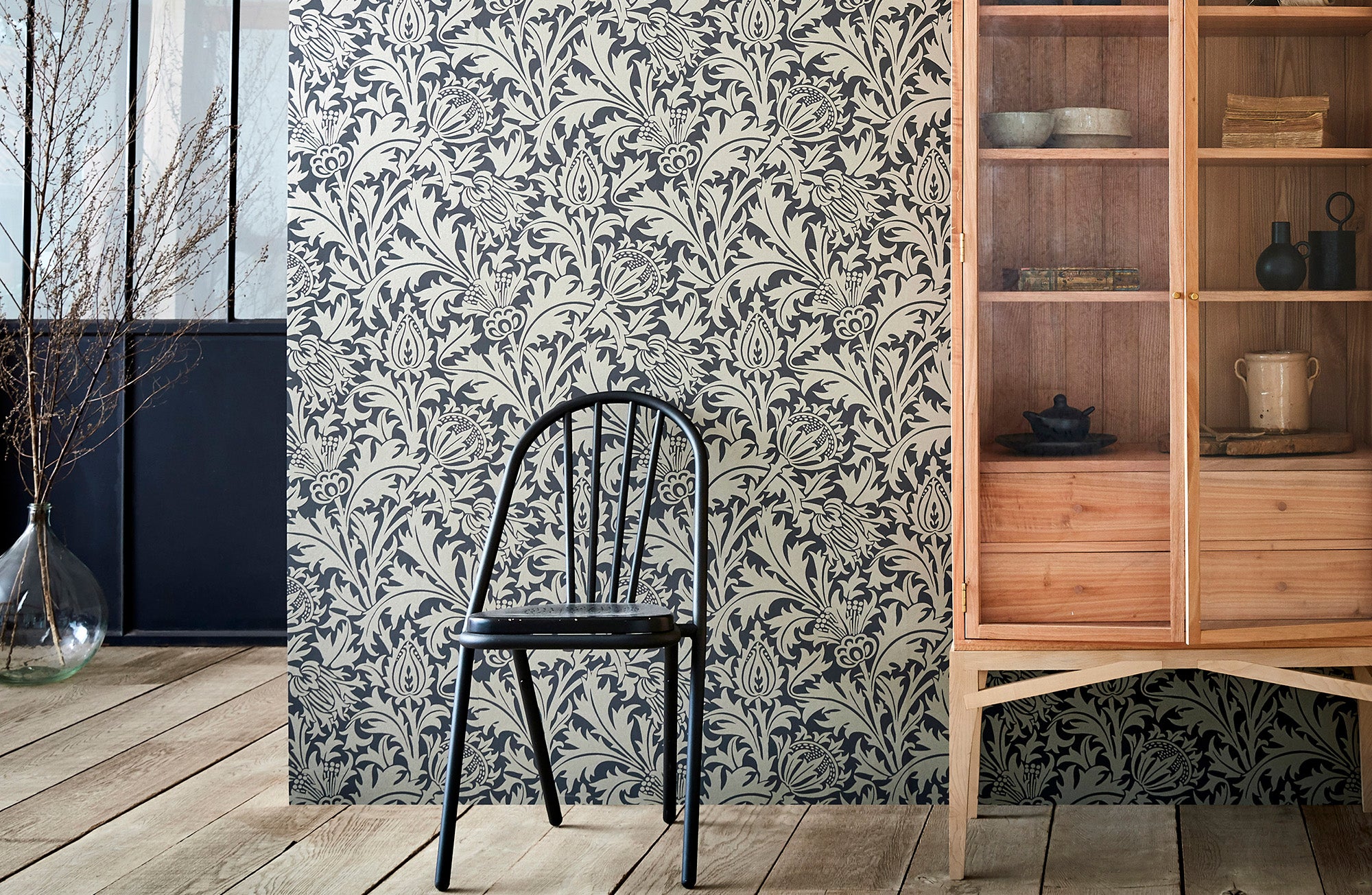 Description: Over-sized, simplified thistle heads framed by scrolling leaves adorn this all-over wallpaper, echoing the neo-Gothic influence of early Morris & Co. Produced in cool colourways and a contemporary Black Ink version, this wallpaper is a modern take on a classic design.