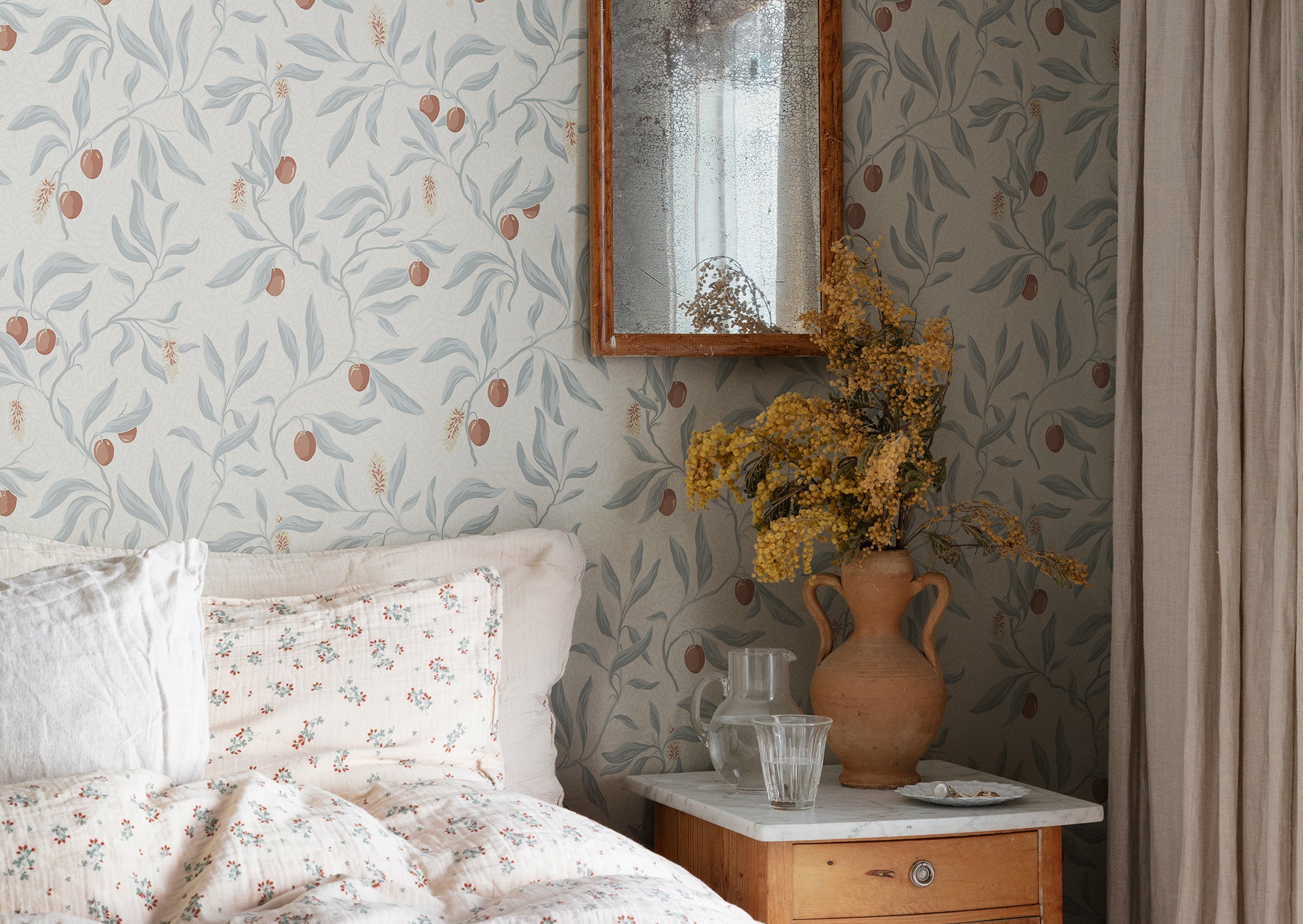 Description: A timeless design of hand-painted branches with lychee fruits layered over a background of small muted leaves. Sandberg makes this wallpaper using a traditional printing technique that gives it a textured surface and a vibrant character.