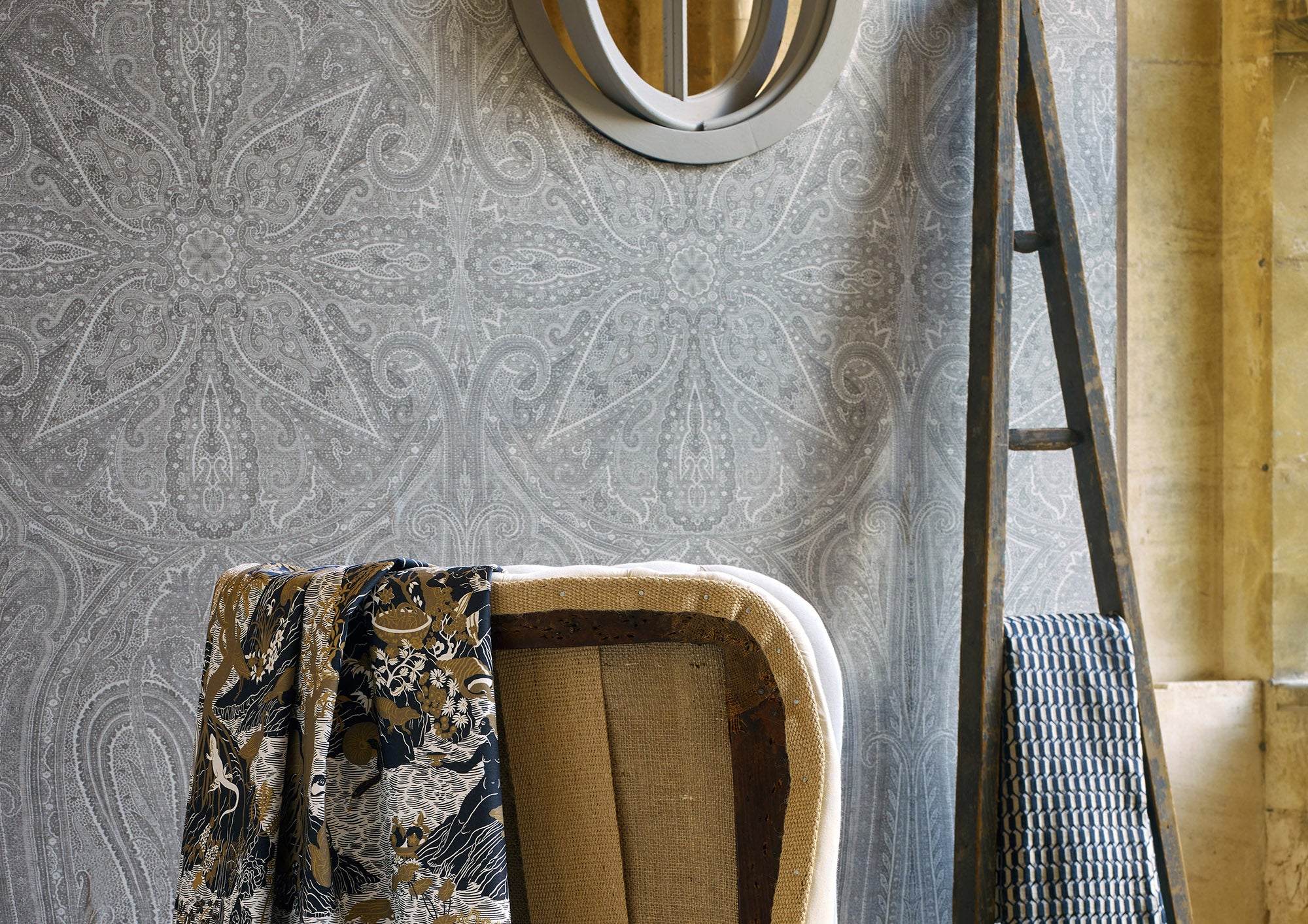 Description: The designers at Zoffany have been inspired by an antique wool shawl from their archive when creating this impactful design. Beautifully detailed decorative patterns adorn this three meter high paisley panel. Produced on grasscloth textured vinyl to imitate fabric on the wall, this wallcovering is extremely hard wearing.