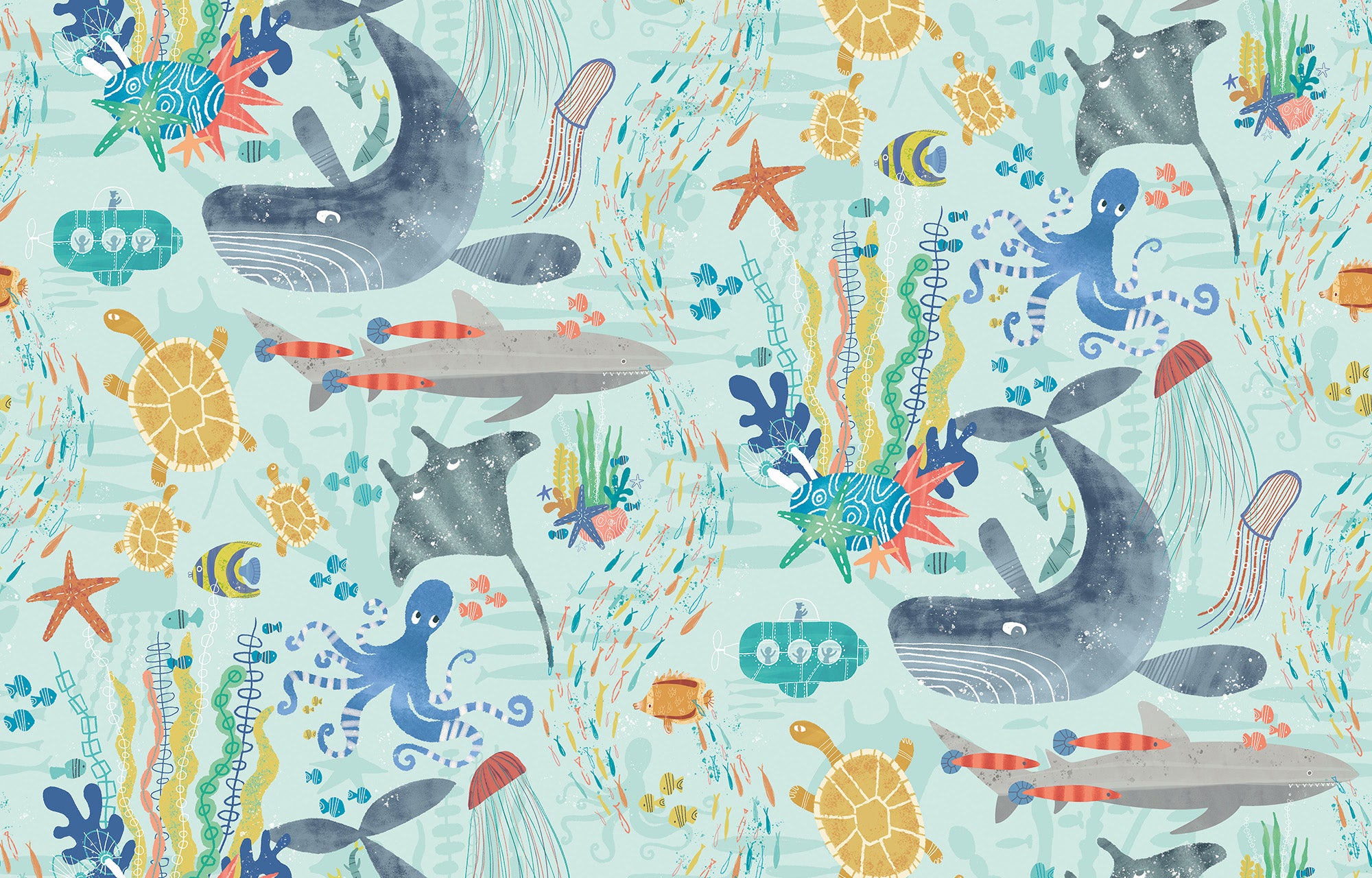 Description: Dive into the deep blue sea and discover the exciting world beneath. This layered design features turtles, whales, rays, and sharks all swimming in the tropical waters. There will be endless hours of discovery with this beautiful feature wallpaper.