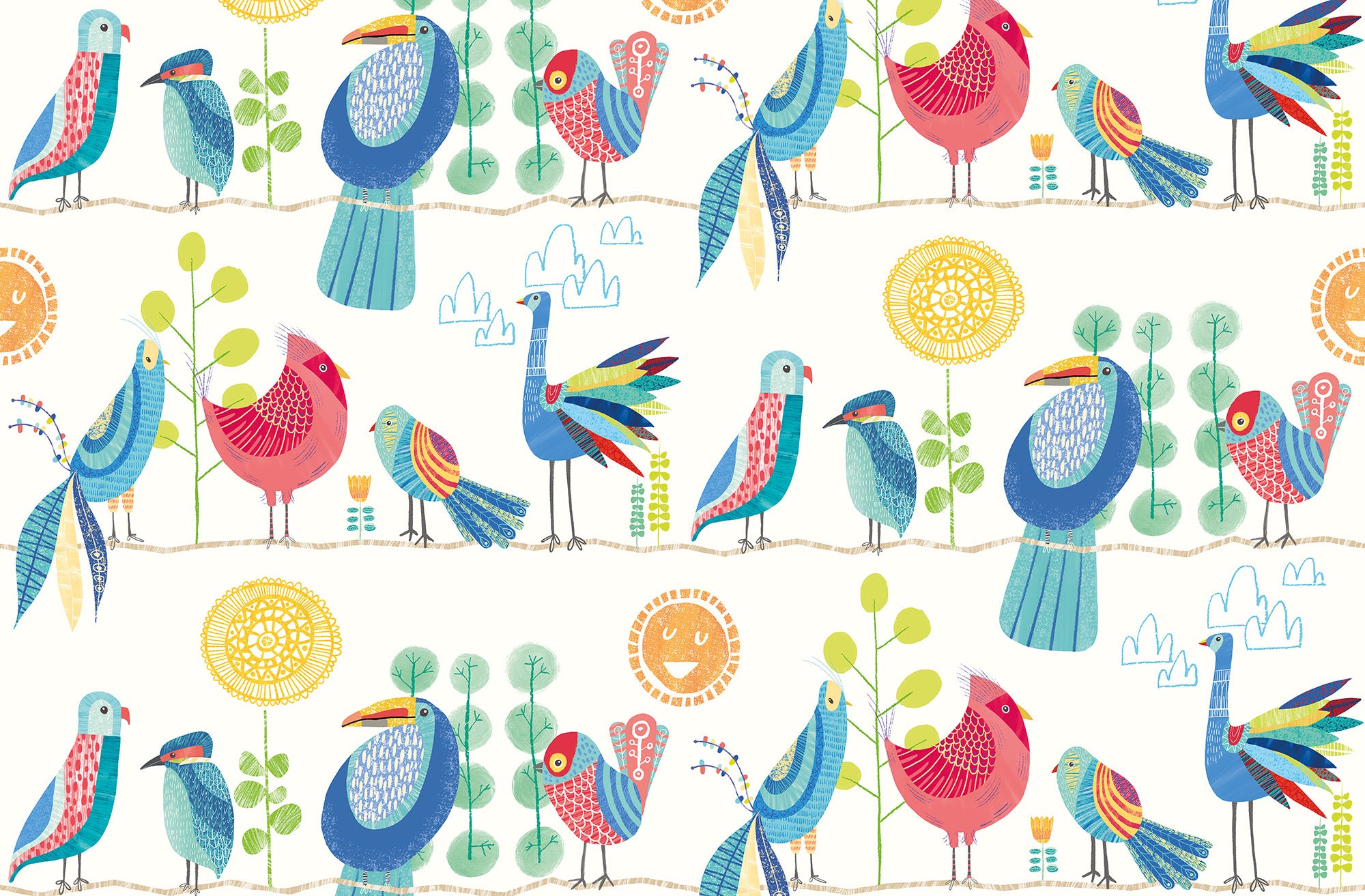 Description: A festival of feathers adorn this design, rows of fabulous exotic birds show off their colourful plumes. Available in 4 fantastic colourways that will suit nurseries, children's bedrooms and playrooms.