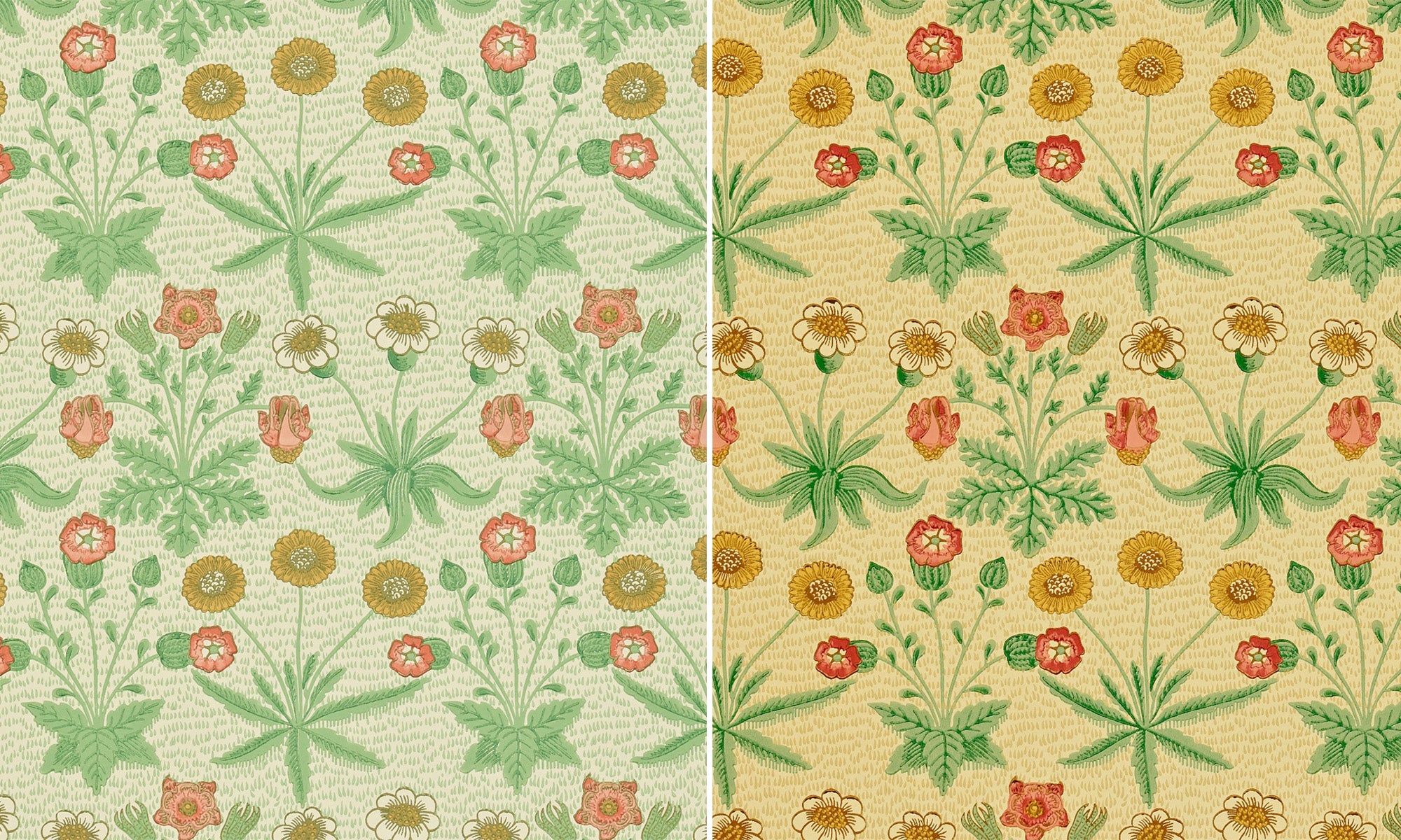 'Daisy' was the first wallpaper to be printed by Morris & Co. in 1864 and displays an unusually flat arrangement of naively drawn wild daisies on tufts of grass.