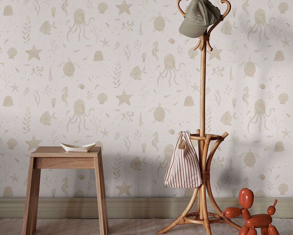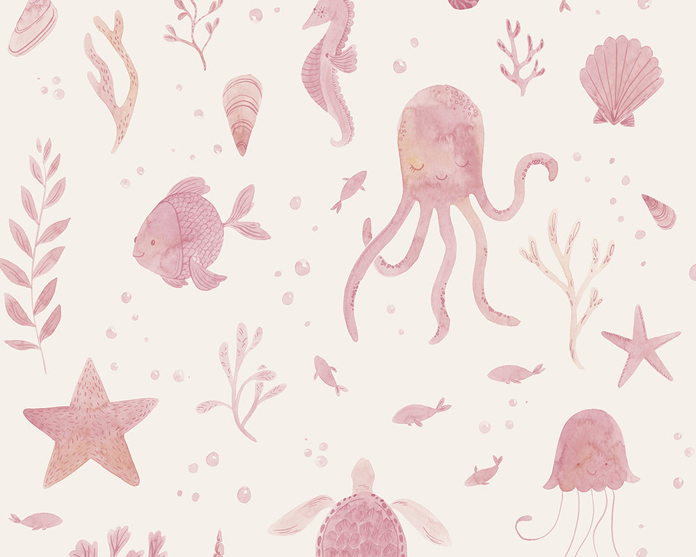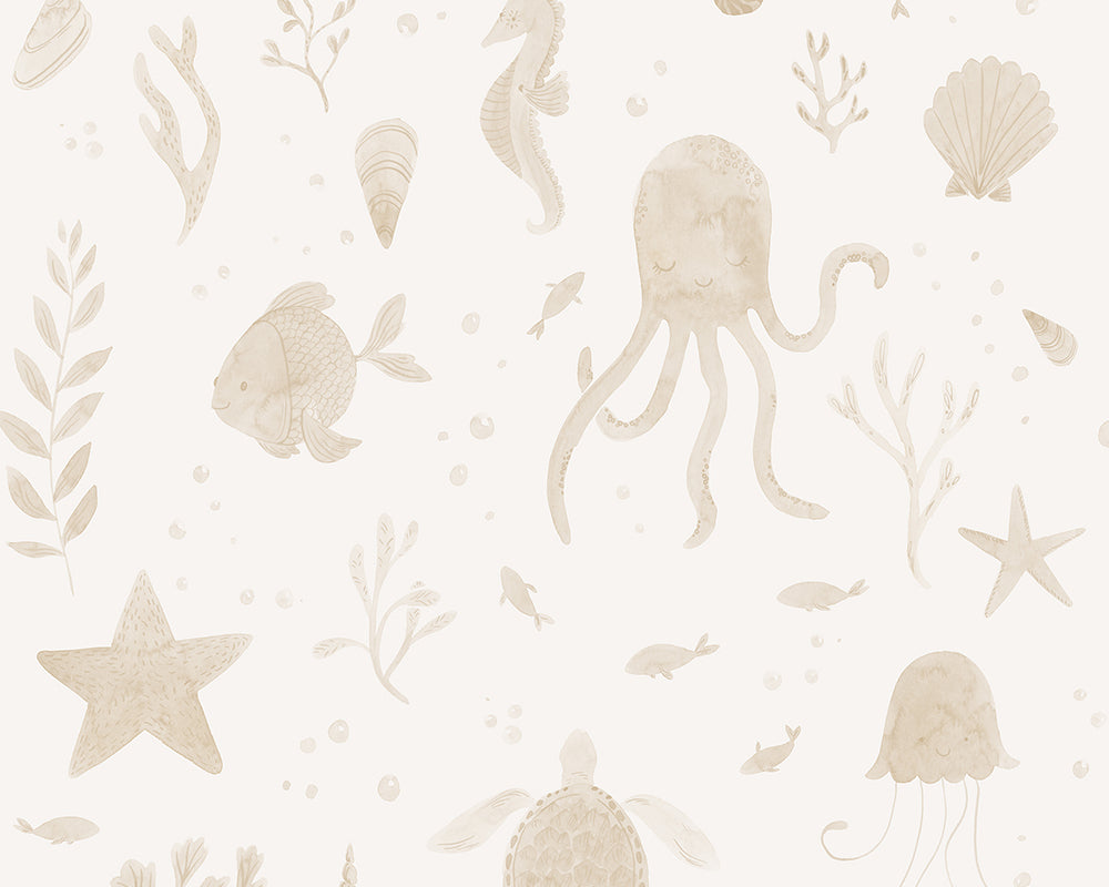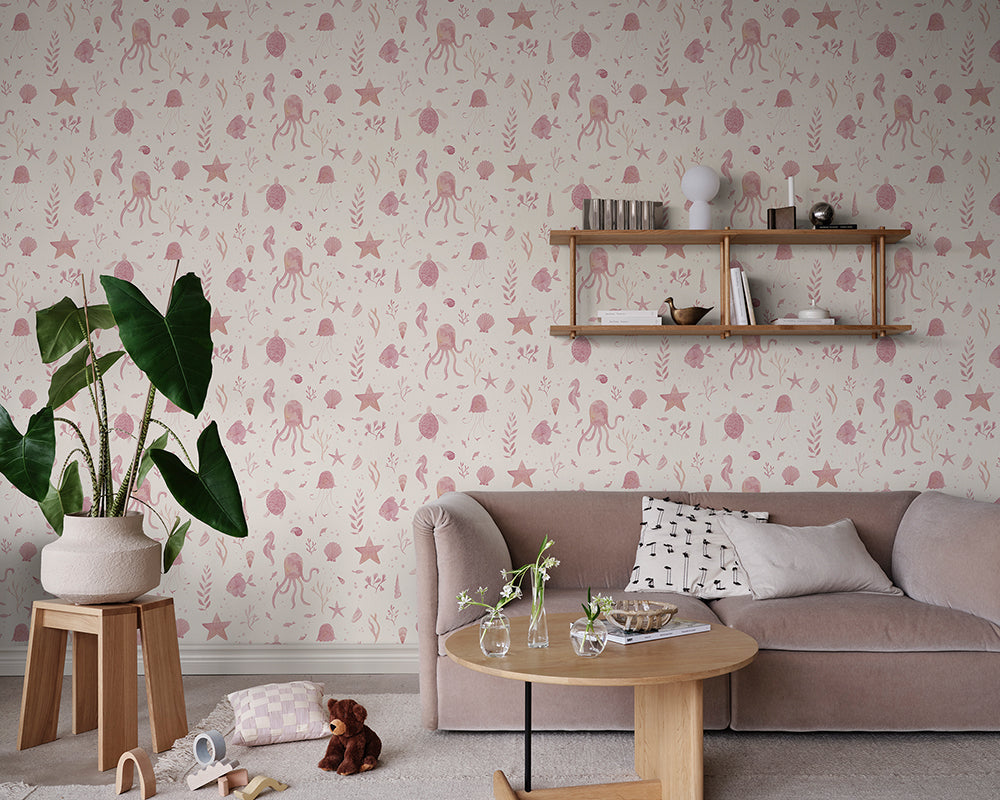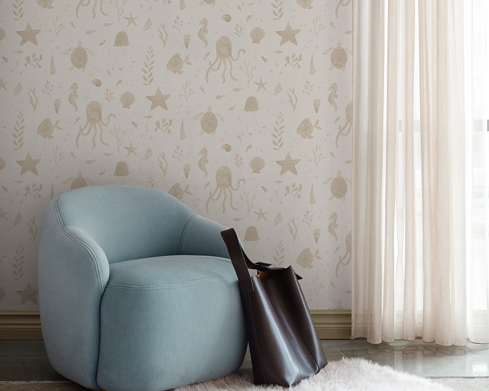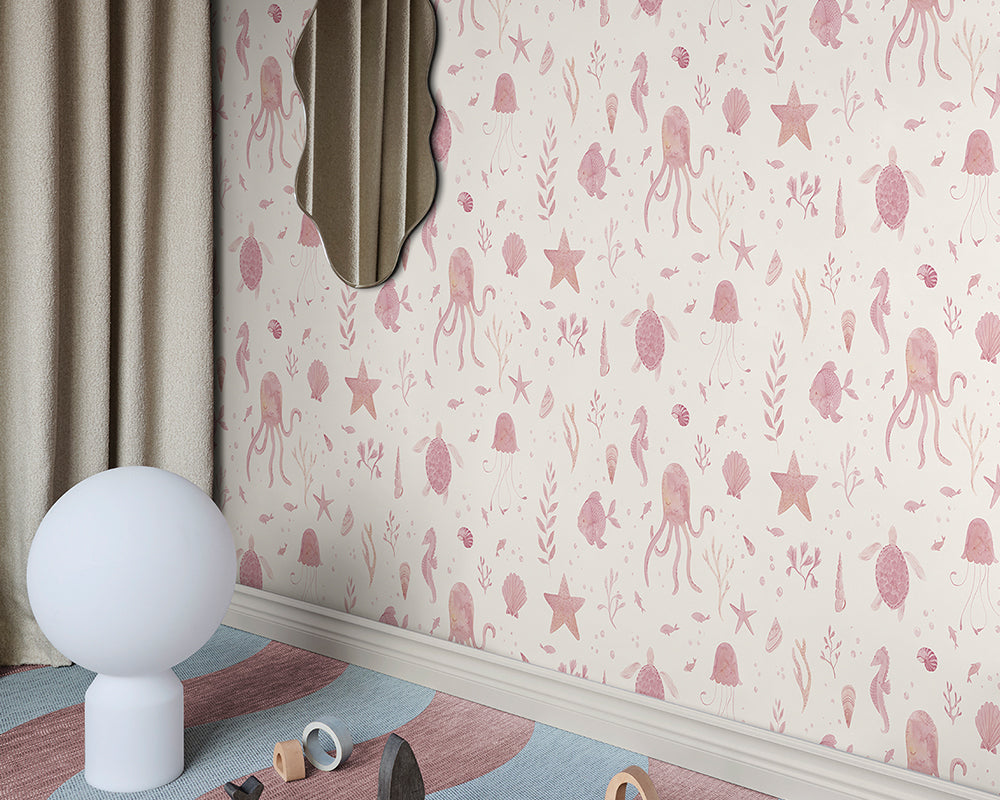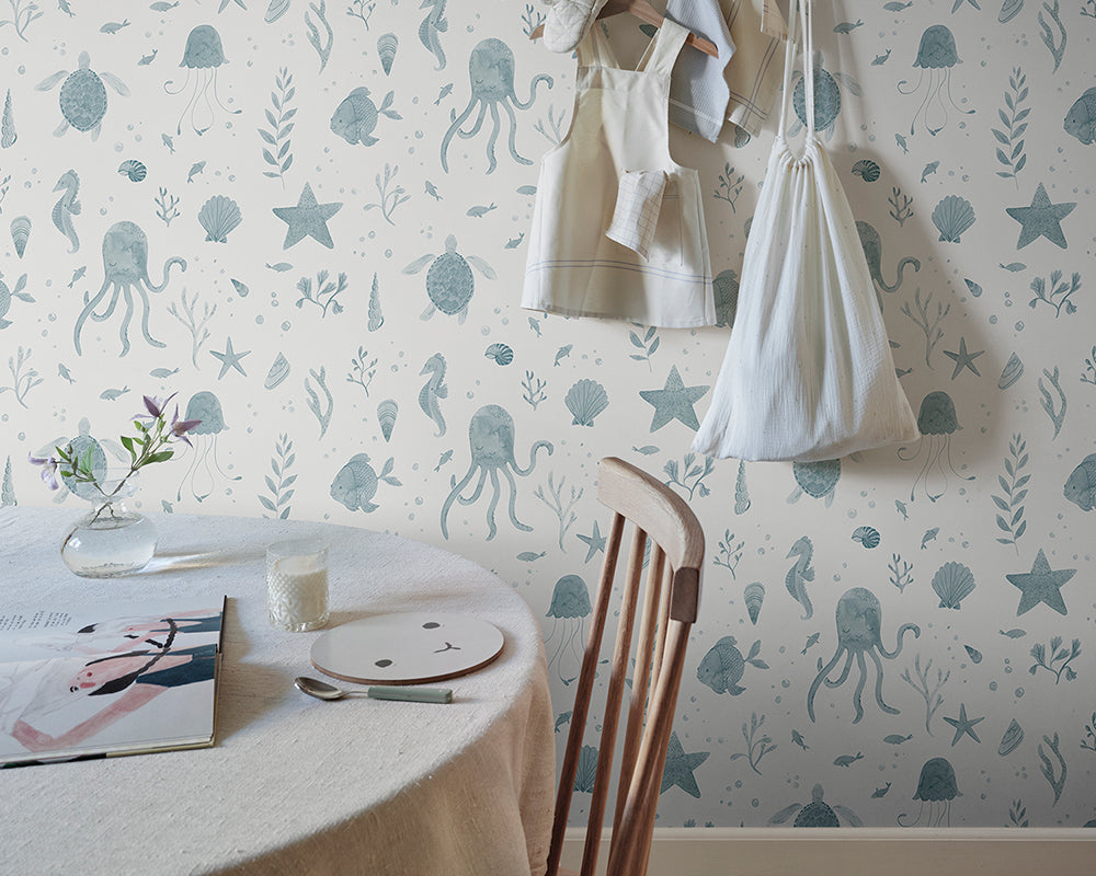 Description: Della wallpaper by Sandberg features a beautiful underwater scene of octopuses, jellyfish, turtles and fish. Perfect for a Scandi inspired bathroom or children's bedroom. Shown here in Ocean Blue.
