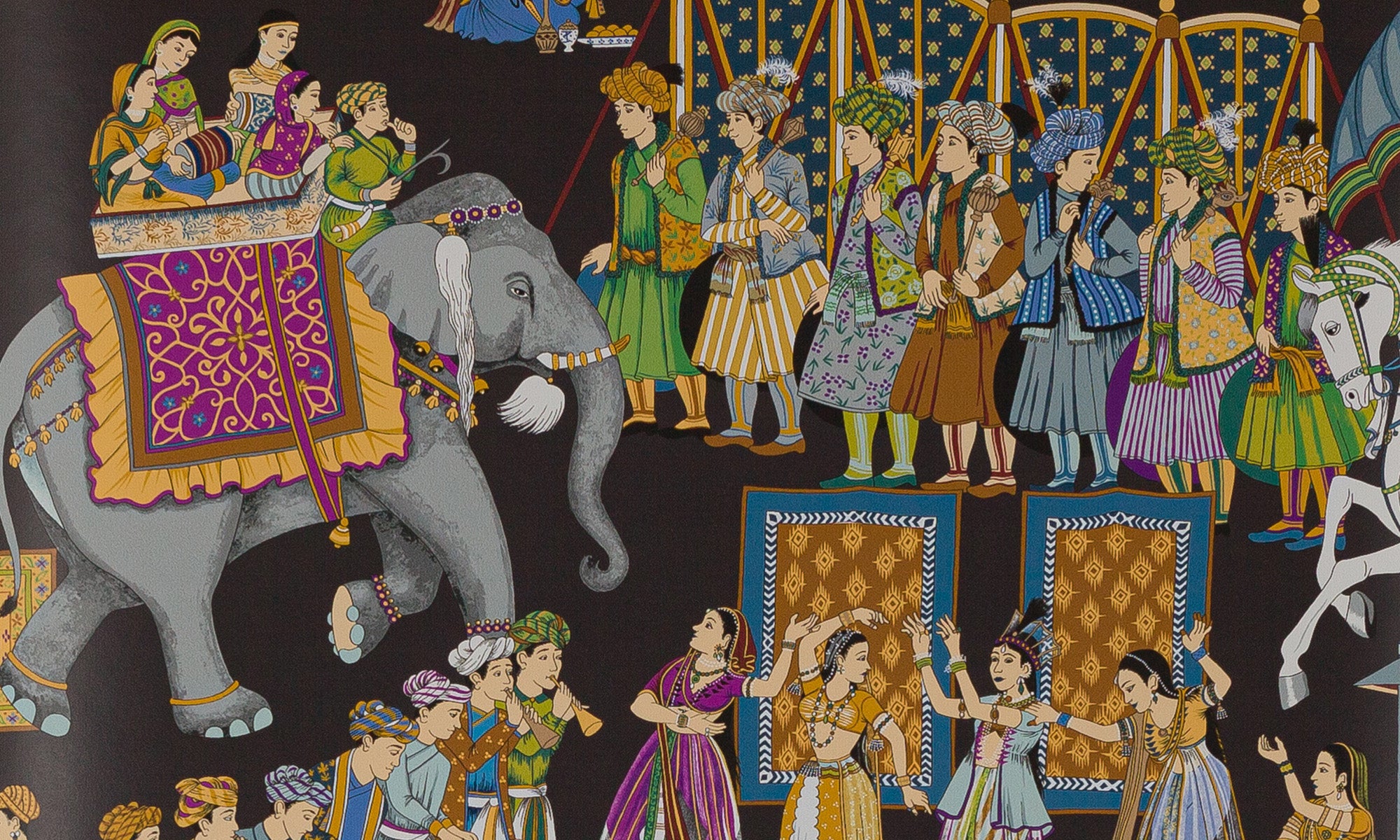 Description: A classic design of Indian dancers and musicians in traditional outfits and vibrant colours. This rich tapestry style wallpaper continues the Manuel Canovas range of bold pictorial signature designs.