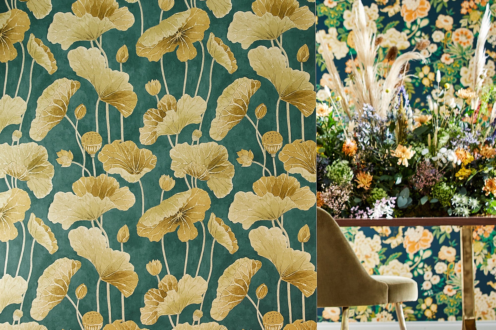 Description: A hand-drawn design featuring elegant long-stemmed lotus leaves reaching skyward. The delicate use of gravure inks adds to the design fluidity and the oversized foliage will make this wallpaper stand out in any home. Sanderson was inspired by the Art Deco period which gives you two exciting colourways using coppers and olive greens.