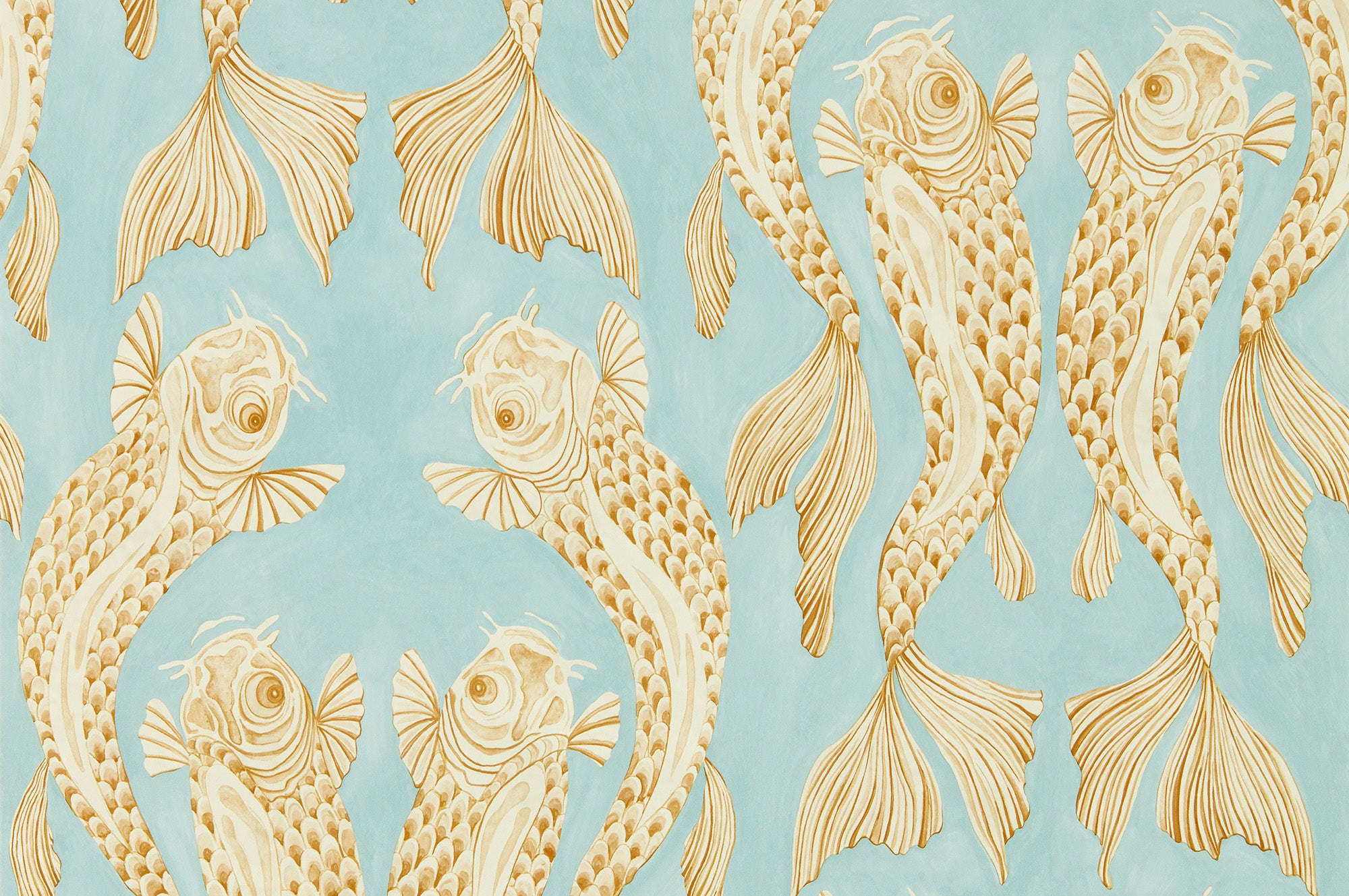 Description: Koi Carp slowly meander up this art deco inspired wallpaper, their beaded scales glimmer softly in the light whilst the soothing painterly ground is reminiscent of delicately rippling water. The soft colourways make this a very versatile wallpaper that could be used throughout the home.