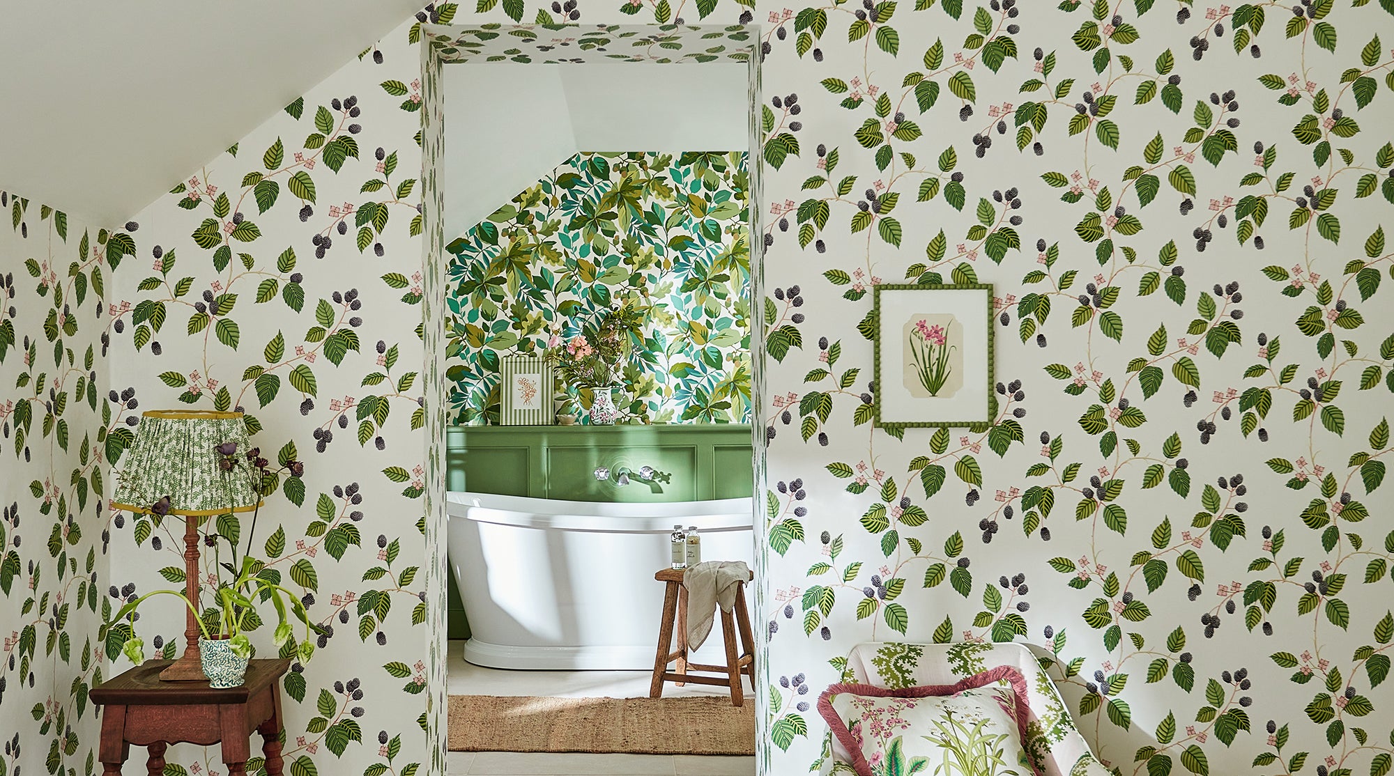 Rubus Wallpaper is available in two colourways of Raspberry and Blackberry both from Sanderson's Arboretum wallpaper collection.