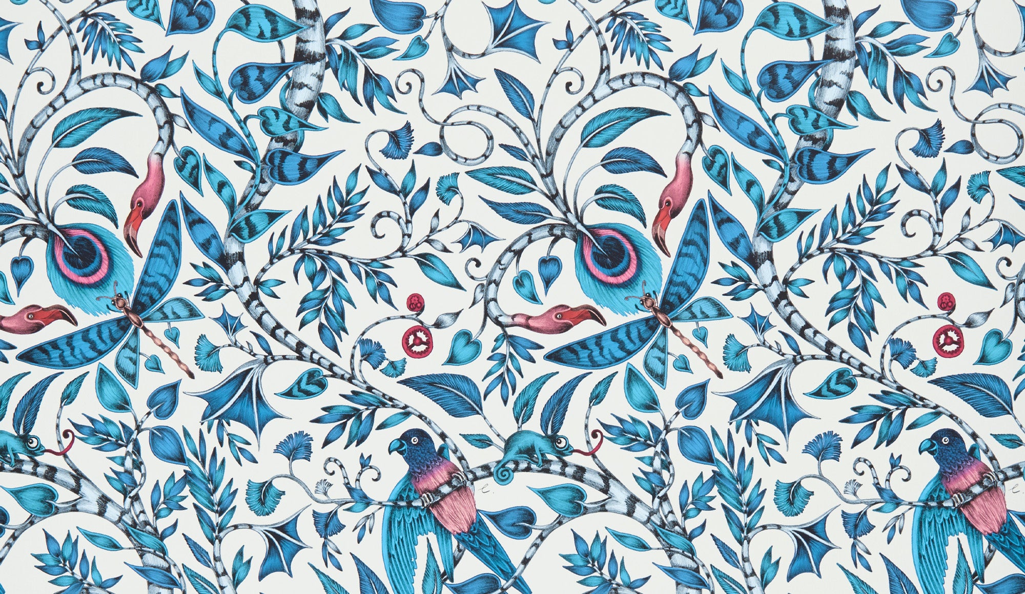 Description: A whimsical wallpaper that gets more intriguing the longer you look at it. This illustrated wallpaper by Emma J Shipley features tropical birds, insects, and trailing foliage. Brought to life in 4 different bold and bright colourways.