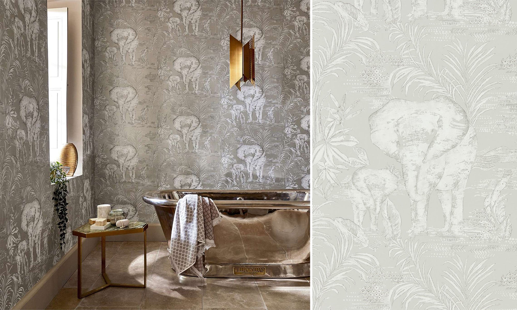 Description: Kinabalu wallpaper is a contemporary toile wallpaper featuring elephants and their offspring entwined in a backdrop of exotic foliage. The chalky foreground is brought to life with the metallic base. A beautiful wallpaper for creating a spa-like bathroom. Room set image for scale reference only.