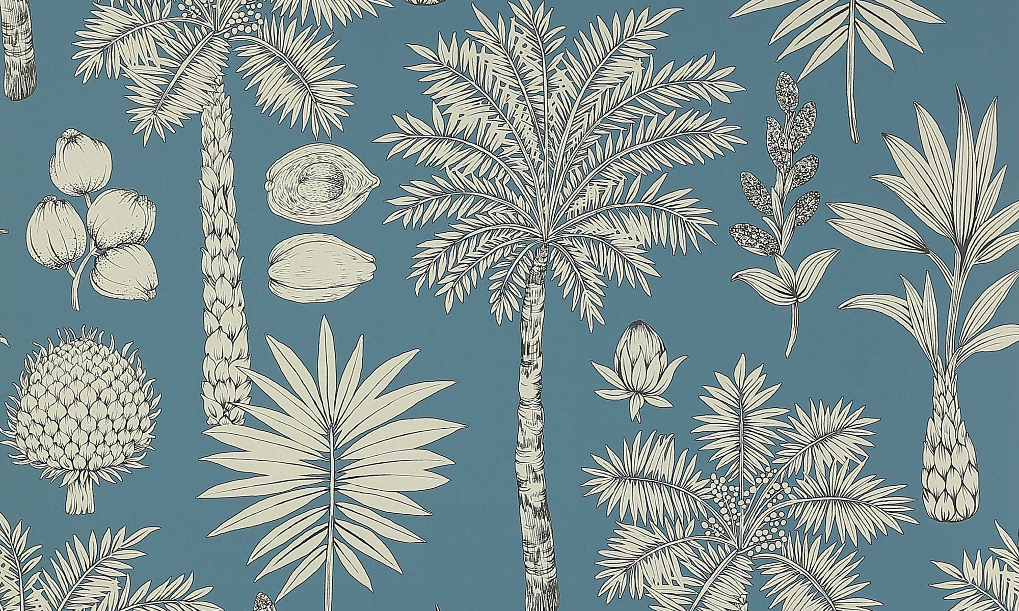 Description: Cote D'azur wallpaper by Manuel Canovas features a tropical pattern of illustrated palm trees, leaves and plants. It's a timeless option to the botanical trend and is available in classic colourways.