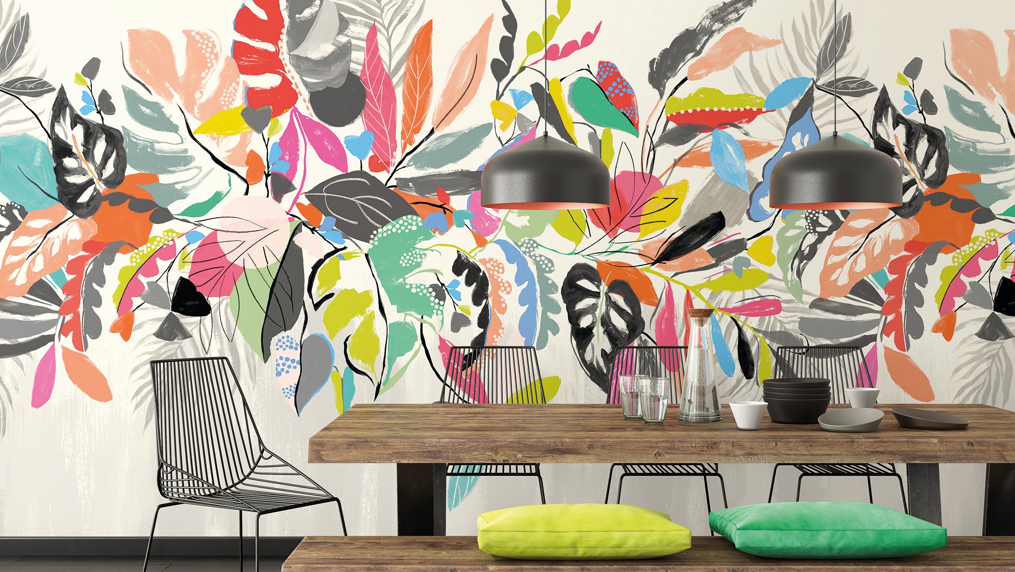 Abstract Tropic features tropical foliage bursting from the centre of the wall.