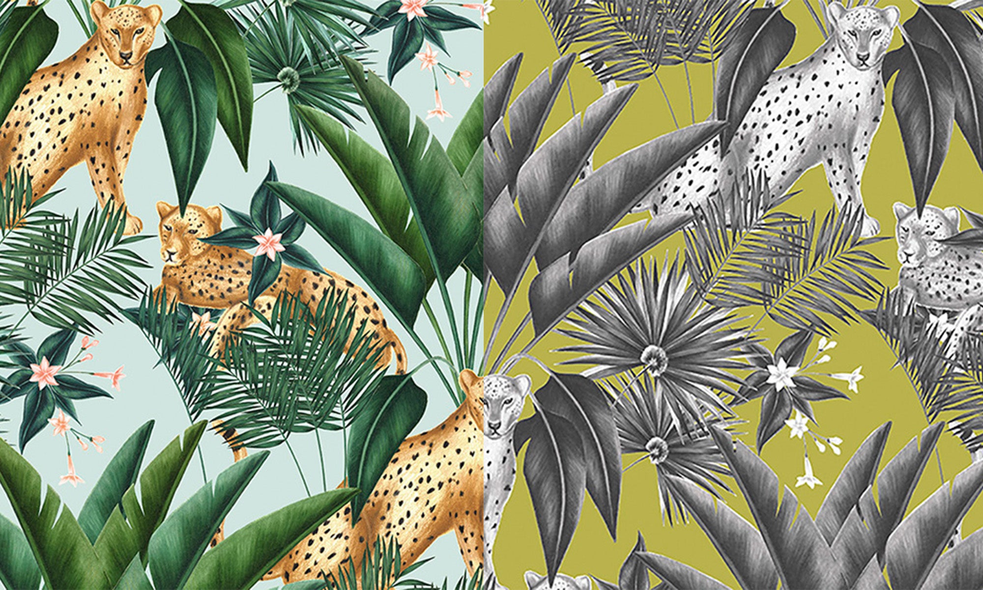 Description: One of OHPOPSI's most popular wallpapers the Jungle Cheetah is now available in three new colourways. The design features a gorgeous cheetah meandering amongst dense tropical leaves. This bold and exotic wallpaper reflects the beautiful animal it's named after.