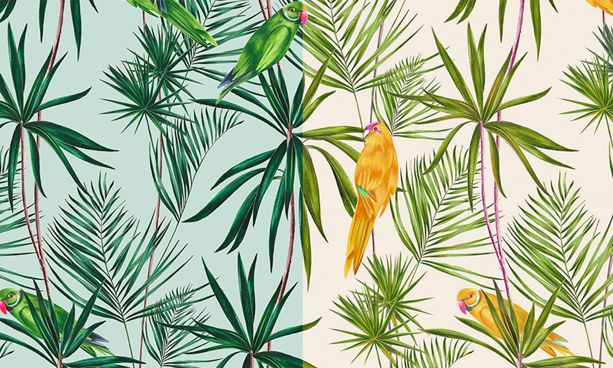 spectacular tropical wallpaper from OHPOPSI's Wild collection, Paradise features an abundance of vibrant Amazonian parrots hanging out amongst the jungle leaves.