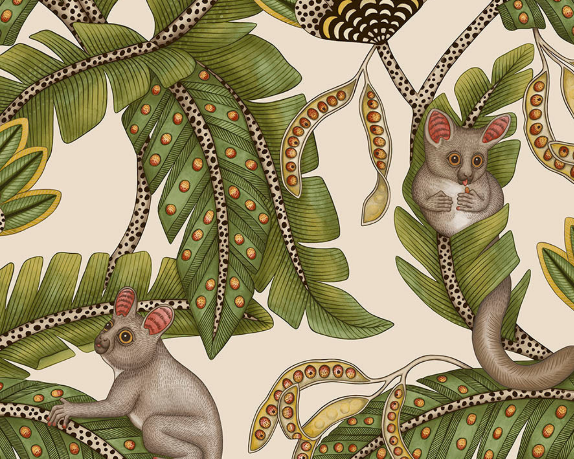 Description: These adorable bush babies are firm favourites of the Ardmore Studio. Here they're nestled amongst a lush canopy beside an African Coral, or 'Lucky Bean'. The colours are bursting with life and vitality. An irresistable wallpaper, available in five colourways.