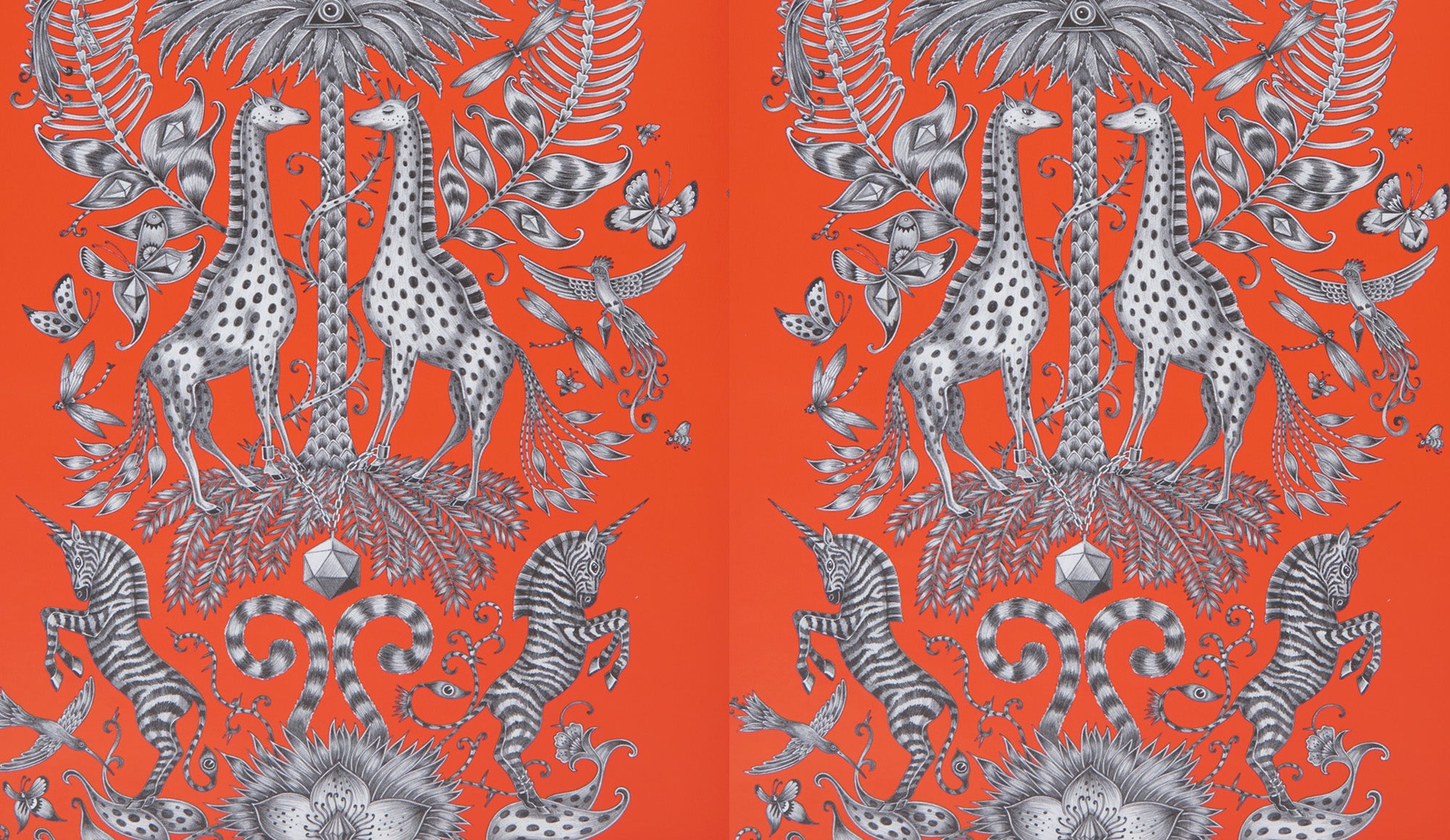 Description: A beautifully illustrated wallpaper design by Emma J Shipley that features a hand-drawn pattern of giraffes, unicorn zebras and tropical birds and insects. All stylised with Aztec inspired palm trees and trailing foliage. This wallpaper is brought to life by the use of bold fashion colours and backgrounds of light reflecting metallics. Available in 8 statement colourways that will bring your walls to life.