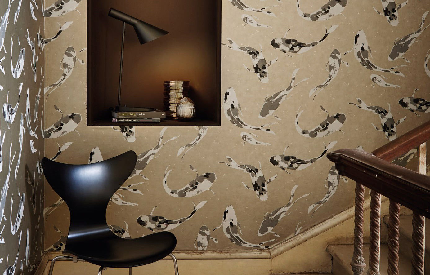 Description: A playful design of painterly fish swimming underneath rippling water. We love this wide width wallpaper for a fun and joyful bathroom pair with panelling for a on trend look.