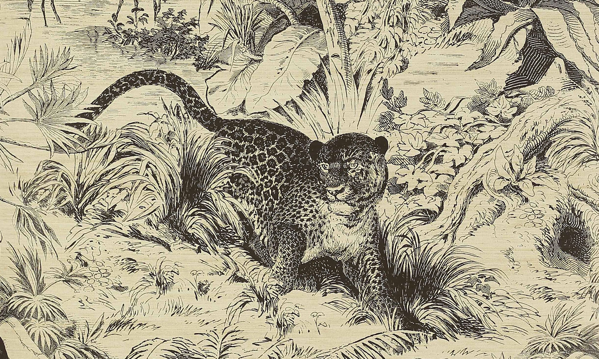 Description: An intricate illustration of a jungle scene including flamingos, leopards and perching monkeys within tropical foliage. Available in a range of subtle colourways with a textured look background which gives this wallpaper a vintage feel.