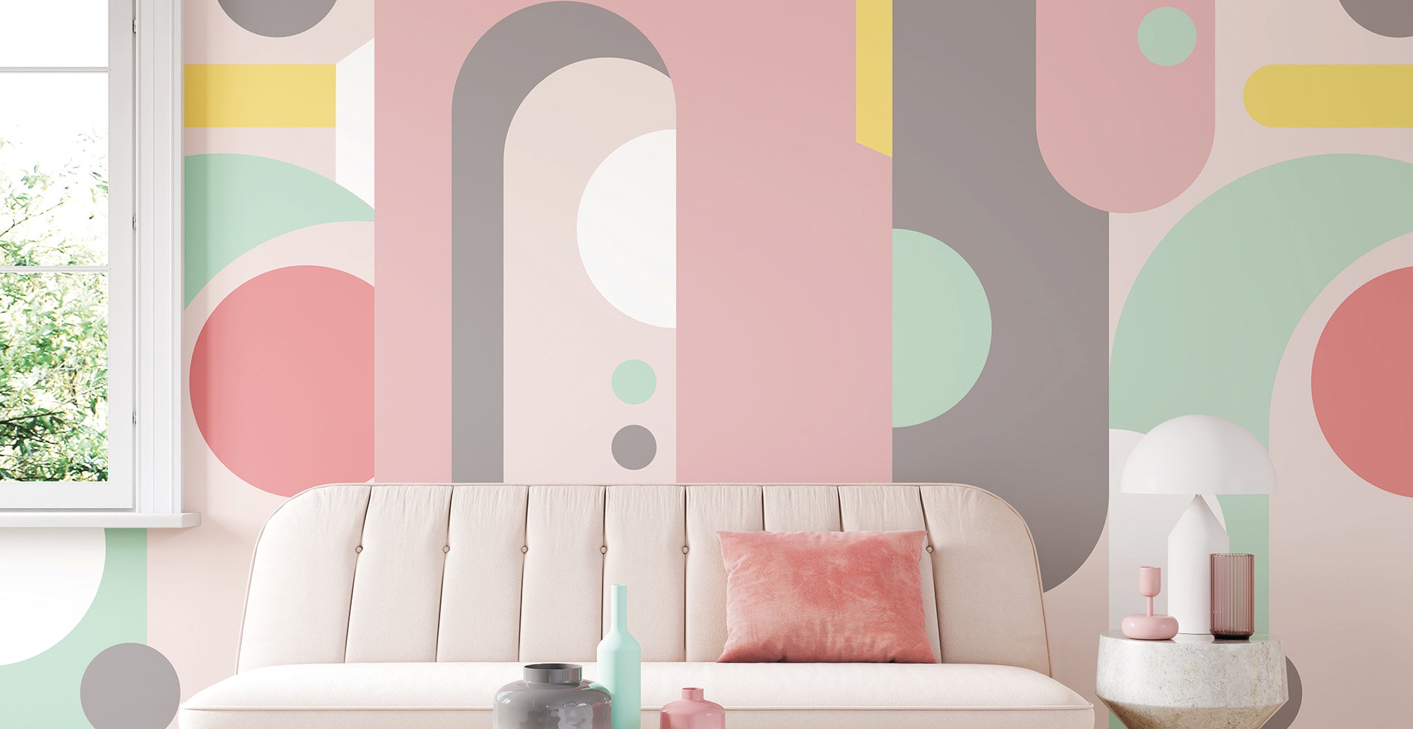 Description: A design of bold architectural shapes, contrasting curves, heights, and lines. The oversized shapes combine to create this contemporary mural.